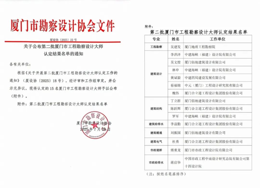 ????近日,廈門市勘察設(shè)計協(xié)會公布第二批廈門市工程勘察設(shè)計大師名單,中元(廈門)蔡福錦榮列其中。